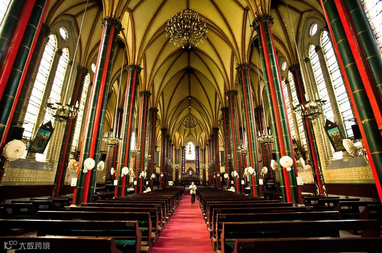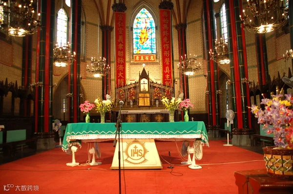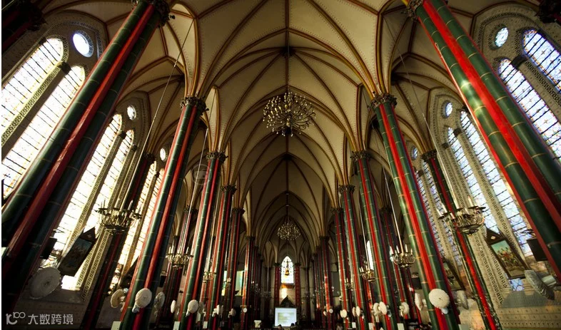 北堂是典型的哥特式建筑。它的四个高高的尖塔,三个尖拱券入口及主跨正中圆形的玫瑰花窗,塑造出端庄而绮丽的立面,在青松翠柏环绕之中越发显得洁白挺拔。