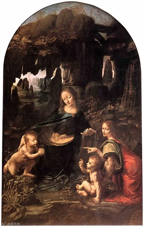 画中人物虽然被一团潮湿的空气所包围,但是人体的轮廓在昏暗山岩的衬托下还是能明显地辨别出来,尤其是画家着力描绘的面庞被刻意营造出的神秘气氛所笼罩,人物轻柔、温存、纯真的表情栩栩如生地突显出来。奇怪形状的悬石从湿漉漉的岩体上垂下,具有植物学准确性的花草从岩缝里穿凿而出,竟然能辨别出鸢尾花,银莲花,紫罗兰和一些蕨类植物。远处蓝色的天空透过岩体之间的孔洞和夹缝呈现在人们的眼前,年轻的母亲以温柔的手搂抱着下跪的幼婴约翰,她的另一只手则向儿子伸过去。天使面向着观众,把他们引向画中,用手指示着这个场面。一连串手势代表保护、指示、祝福等含义,这一组人物是按金字塔的构图原理组建安排的,塔顶是圣母的头,侧边是她伸出的双手,底角是天使和婴儿。达·芬奇把结构看作打开作品意图的钥匙,这很大程度上形成了盛期文艺复兴的古典主义金字塔式的人物构图。