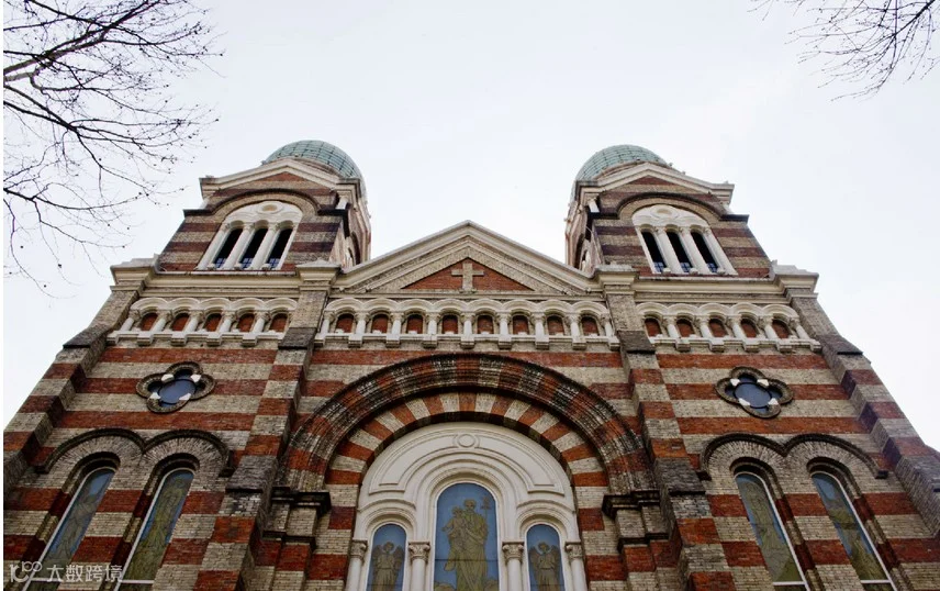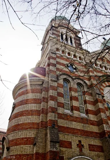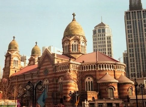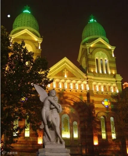 西开教堂又称法国教堂。在天津和平区滨江道独山路原墙子河外老西开一带,即今西宁道营口道交口旁,故名。包括天主教总堂和大教堂,分别建于1914年和1917年,为法国天主教所建。大教堂采用法国罗曼式建筑造型,高45米,建筑面积1585平方米,平面呈长十字形,正面和后部耸立高大塔楼三座,呈“品”字型,楼座以黄、红花砖砌成,上砌翠绿色圆肚形尖顶.檐下为半圆形拱窗。堂内为三通廊式,内墙彩绘壁画,装饰华丽。西开教堂是天津教堂中规模最大的一座。