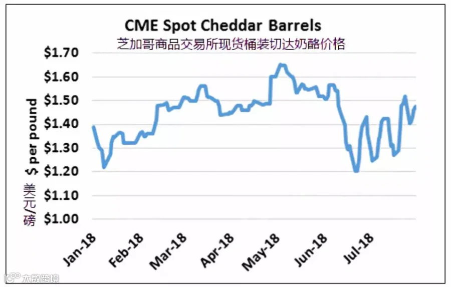 六月美国的奶酪产量达10.6亿磅,与去年相比增长1.8%。切达奶酪的产量更加强劲,较去年同比涨幅4%。这可能可以解释芝加哥商品交易所(CME)六月和七月初桶装切达乳酪市场疲软的原因。在初夏的几个月,奶酪生产商可以获得大量打折的牛奶,对于大多奶酪工厂而言桶装切达奶酪是提升产能的最有效的方法之一。奶酪生产厂家对生产出口的奶酪品种也十分谨慎;与贸易相关的不确定性有可能推动桶装奶酪的生产。