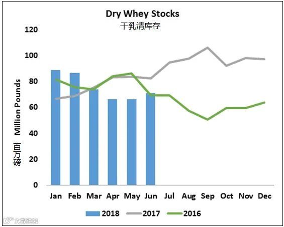 本周乳制品市场小幅度走高。芝加哥商品交易所(CME)现货干乳清价格增长1美分,创新高收于43.5美分/磅。乳清市场仍然相对紧张,这有助于稳定三级奶市场。食品级干乳清六月的产量为8590万磅,与去年同期相比下降0.8%。乳清粉库存量与四月和五月的极低水平相比有所回升,但仍低于去年同期13.8%。乳制品生产商继续大量浓缩乳清蛋白粉。今年上半年,美国的浓缩乳清蛋白粉的产量较2017年同期增长3.2%。