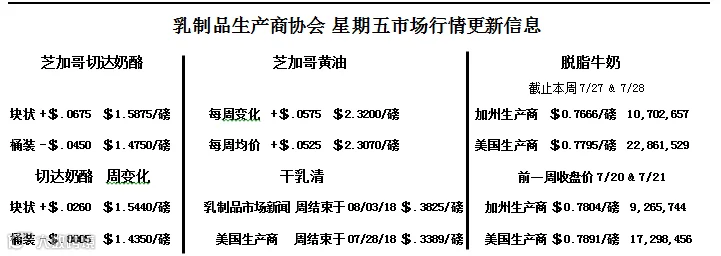 芝加哥商品交易所(CME)的现货块状切达乳酪强势反弹,打破了近期下跌趋势。本周块状切达乳酪价格上涨6.75美分,收于1.5875美元/磅。桶装切达乳酪的价格持续升高,明显高于前几周的价格低位。然而他们未能达到上周五的最高价。桶装切达乳酪今天收于1.475美元/磅,本周下跌4.5美分。8月三级奶的期货价格也有所下跌,收于14.88美元/100磅,接下来期货价格会有所上涨,大多数合同价格都上涨5~15美分。美国农业部宣布7月份三级奶的期货价格收于14.10美元,较6月下跌1.11美元,与去年同期相比下降1.35美元。加州4b牛奶价格与六月相比下降34美分,收于14.09美元。