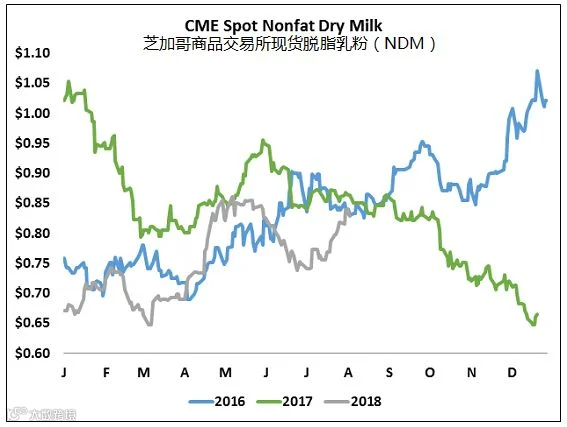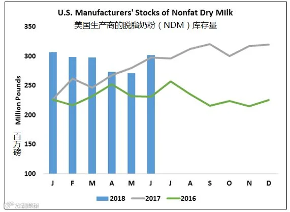 六月,美国出口1亿2530万磅奶粉,远低于2月至5月强劲的出口量,但仍比去年同期增长24.2%。六月的脱脂奶粉(NDM)和脱脂奶粉(SMP)的联合生产为2亿710万磅,与二月以来的日平均产量相当,与2017年6月相比增长2.4%。但尽管出口强劲,脱脂乳粉(NDM)的库存量仍跃升至3亿190万磅,与去年同期增长1.4%。2017年末和今年年初库存量达到如此大规模时,现货奶粉价格在65~75美分之间萎靡不振。紧跟着是期货脱脂乳粉(NDM)今天的跌价。尽管如此,芝加哥商品交易所(CME)现货脱脂乳粉(NDM)的价格今天收于82.75美分,较上周增长1美分。今天的价格表明自六月下旬,脱脂乳粉(NDM)的库存以来已经有所收紧。