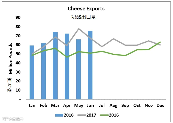 贸易战持续占领头条新闻,但目前奶酪生产商和乳制品生产商可能会发现国内需求-占美国奶酪产量的95%-更值得关注。尽管经济蓬勃发展,工资上涨,餐馆销售也在加速,但国内奶酪消费并没让人惊喜。相比之下,出口依然强劲。六月,美国出口了7540万磅奶酪,与去年同期相比涨幅达12%。对墨西哥出口量与去年同期相比增长17.4%,可能是买家在七月初关税调整前的开始大量采购。据报道,美国和墨西哥政府基本上就北美自由贸易协定改革达成协议希望在几个月后,他们能够达成协定,并取消墨西哥对美国奶酪出口的惩罚性关税。