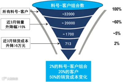 于是我们就导入第二道过滤器:销货成本。我们把上述的销量变化,乘以产品的单位成本,得到相应的销货成本变动。我们把销货成本下降超过1万元(意味着最多可能有1万元的库存积压),或者上升超过5万元(意味着可能有短缺)的筛选出来,得到1700个料号—客户组合。这些产品有显著的库存影响,要么短缺,要么过剩,对业务影响也更大。
