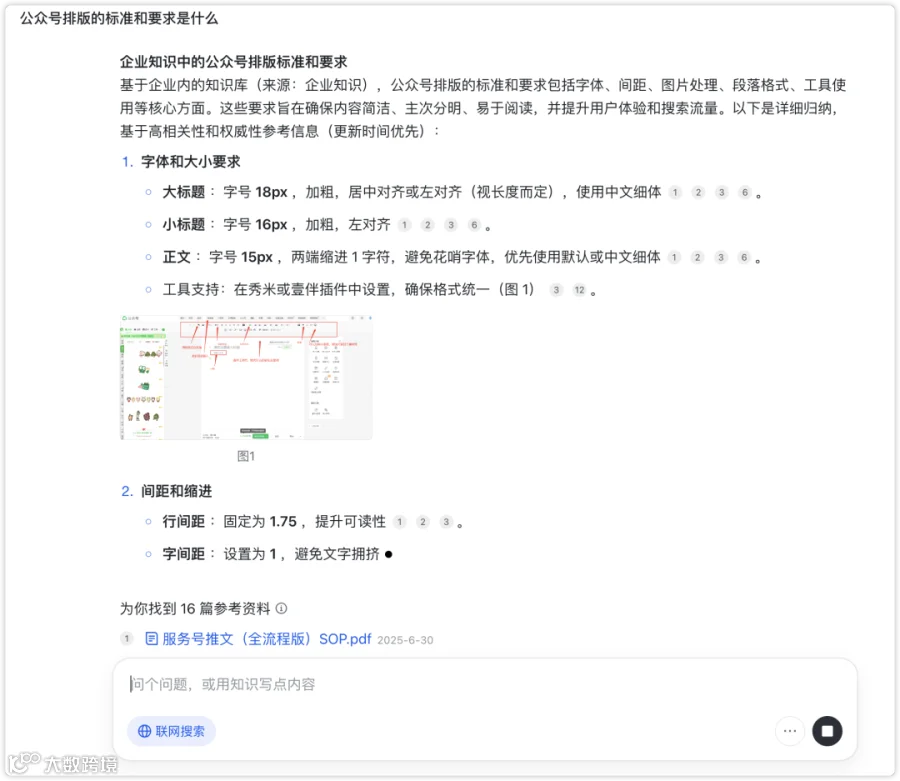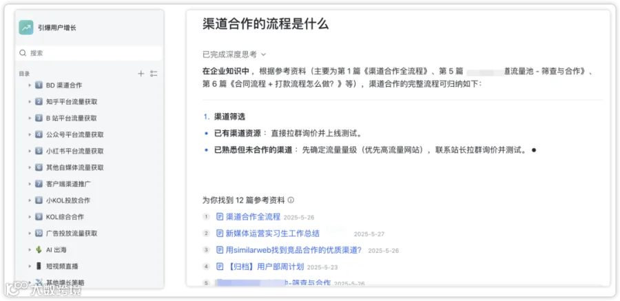 AI 知识库到底有什么价值,我主要分享两点非常重要的方向:1、各种知识、文件、资料都塞进去,提高资料的检索效率如果你就很懒不想整理工作资料,也不想分类,你就一股脑上传到 AI 知识库工具就好了,AI 会在未来你需要的时候调取的。2、AI 基于你的私人知识给你有针对性的回答这一点很关键,我们很多时候去用大模型产品的时候,总是觉得很空很大,没有参考价值,原因核心是大模型是基于互联网公开的数据回答你的,而AI 知识库是基于你的私人信息回答的,这样的答案对你更有参考价值。例如: