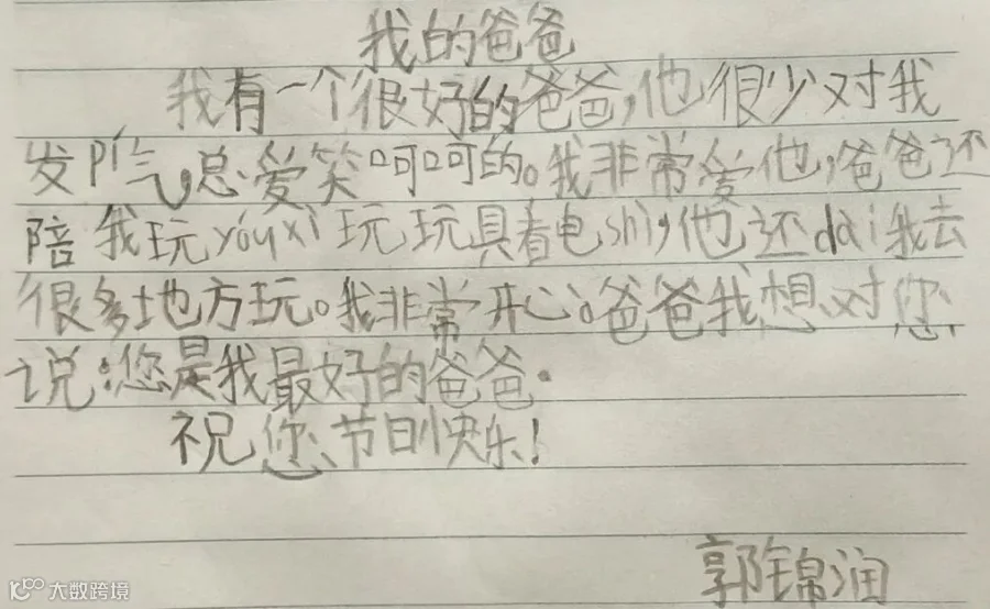 我有一个很好的爸爸,他很少对我发pí气,总爱笑呵呵的。我非常爱他,爸爸还陪我玩yóu xì、玩玩具、看电shì,他还dài我去很多地方玩。我非常开心。爸爸我想对您说:“您是我最好的爸爸,祝您节日快乐!”