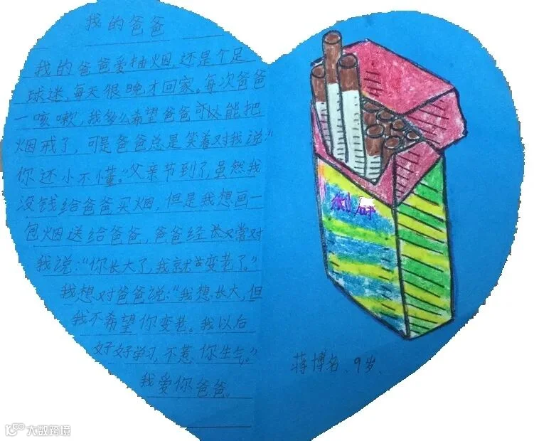 我的爸爸爱抽烟,还是个足球迷,每天很晚才回家。每次爸爸一咳嗽,我多么希望爸爸能把烟戒了,可是爸爸总是笑着对我说:“你还小不懂。”父亲节到了,虽然我没钱给爸爸买烟,但是我想画一包烟送给爸爸,爸爸经常对我说:“你长大了,我就变老了。”我想对爸爸说:“我想长大,但我不希望你变老。我以后好好学习,不惹你生气。”我爱你爸爸。