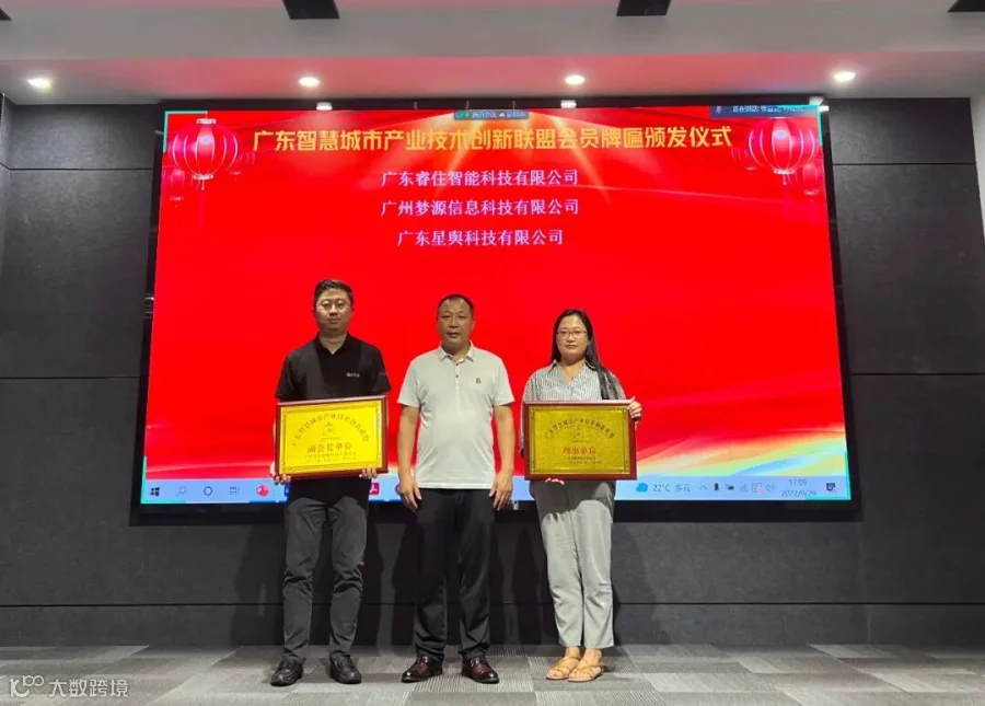 ▼广东智慧城市产业技术创新联盟岳浩执行副会长为2家会员单位:广东睿住智能科技有限公司、广东星舆科技有限公司颁发会员牌匾。