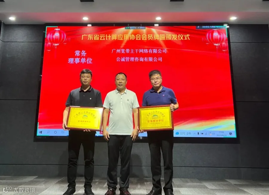 ▼广东省云计算应用协会岳浩执行副会长为两家常务理事单位:广州宽带主干网络有限公司、公诚管理咨询有限公司颁发会员牌匾。