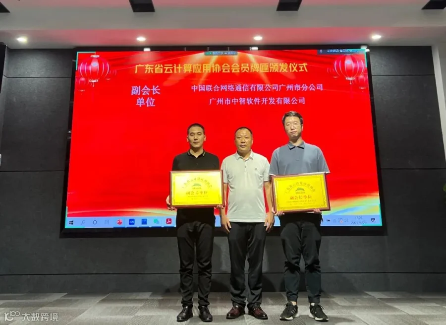 ▲广东省云计算应用协会岳浩执行副会长为两家副会长单位:中国联合网络通信有限公司广州市分公司、广州市中智软件开发有限公司颁发会员牌匾。