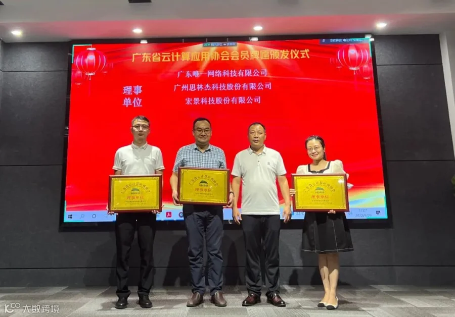 ▼广东省云计算应用协会岳浩执行副会长为3家理事单位:广东唯一网络科技有限公司、广州思林杰科技股份有限公司、宏景科技股份有限公司颁发会员牌匾。