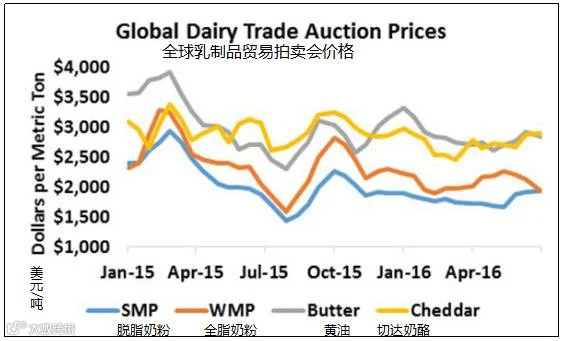 经历了一个非常艰难的上半年后,希望下半年的牧场财政状况会略有好转,明年继续得到改善。7月到12月,三级奶期货平均价格为15.90美元/100磅。2017年期货价格为16.27美元/100磅。希望明年的价格将会继续走高,但这在很大程度上仍然是基于乳制品生产商在经历惨痛损失后将会限制生产这样一个假设上。在某些地方,很明显出现生产量有所削减,但在其他地方则只是短暂的现象。较小的屠宰率表明美国乳品生产商仍在大量生产牛奶,他们都在等待竞争对手削减牛群数量。在某种程度上,生产商的这种忍耐是受夏季价格回弹的行情影响的。今年的高价可能会削弱明年的可能性。