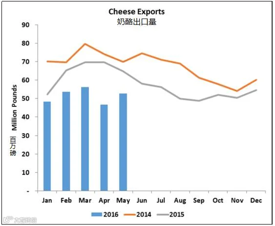 鉴于美元走强以及美国与国际的奶酪和黄油持续存在的价差,5月份的美国出口持续萎靡也就不足为奇。5月份的美国黄油出口总量仅为130万磅,是自去年9月以来的最低出口量。进口量达390万磅,较去年同期增长了26%。奶酪出口量为5270万磅,达到了2016年的预期,但仍比去年同期下降了18.3%。