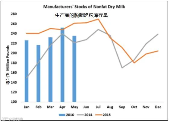 5月份脱脂奶粉(NDM和SMP)产量总计为2.153亿磅,略低于去年同期。奶粉出口量连续第三个月低于去年同期。今年至今的出口量已经下降了11%,而且价格会继续下跌。为了保持产品流通,出口商把销售价格下调到83.5美分/磅的平均价格,创下多年来的新低。尽管如此,5月,生产商的脱脂奶粉库存量已经缩减至2.354亿磅,比4月份下降了6.6%,与一年前相比,几乎降低了10%。