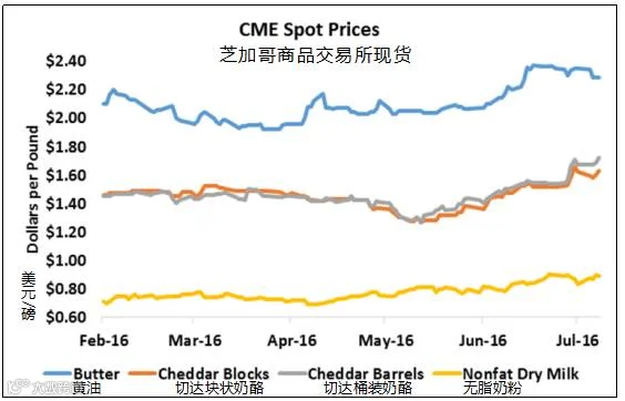 尽管人们普遍担忧着全球经济,以及受到美元走强的威慑,但本周的芝加哥商品交易所现货脱脂奶粉(NDM)价格仍然上涨。现货脱脂奶粉价格上涨了5.5美分,达到89美分/磅。现货黄油市场价格在周二下跌,并且再也没有恢复过来。本周下跌6.75美分,收盘价为2.2825美元/磅。大部分四级奶合约价基本下跌范围稳定在20美分以下。