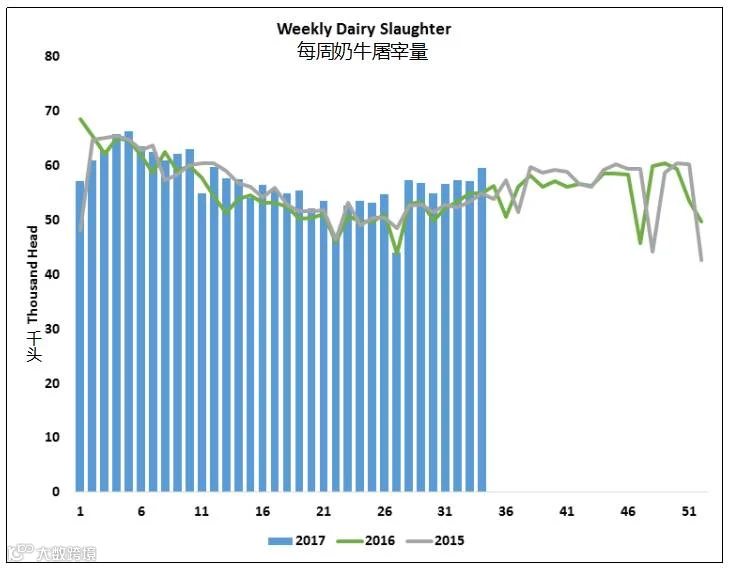 截止至8月26日当周,奶牛的屠宰量为59,612头,是自三月以来的最大单周屠宰量。这比去年同周高出8.4%,使2017年的屠宰率比2016年增长3.7%。考虑到农场经济,屠宰量可能还会持续上升。过去几周的价格下跌对那些看惯了期货价格在16~17美元的乳制品生产商来说无疑是令人沮丧的。然而,今年这个行业的情况更加糟糕。三月到五月三级奶的平均收盘价为15.53美元,四级奶14.27美元。第四季度要求三级奶和四级奶的价格在15美元范围内。基于8月和9月定价牛奶,价格会好很多。尽管饲料价格低将有助于减轻一些损失,但之后如果今天的价格维持不变的话,可能会预见这个行业的股价有所下跌。考虑到加工厂和仓库的容量局限,一定程度的合并是有利于行业发展的,尽管这是个痛苦的决定。