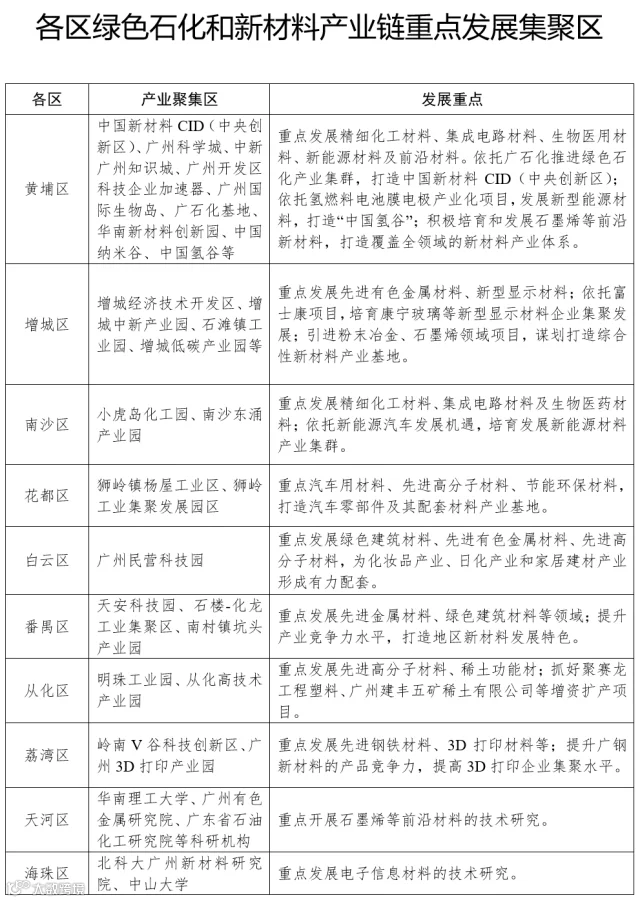 广州绿色石化和新材料产业自诞生起,就突出强链、延链、补链发展。广州除了越秀区之外的10个行政区均将布局该产业链重点发展集聚区,以实现集群化发展。在广州科学城南部,黄埔中国新材料CID(中央创新区)方兴未艾,广州前20名中新材料先进企业,黄埔区就占了10家。