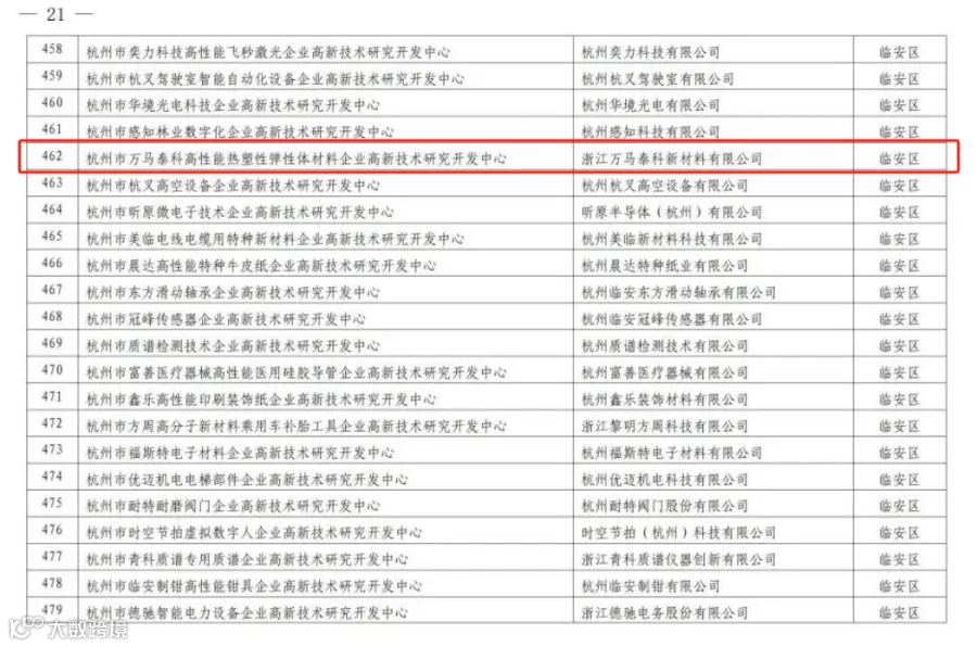 公司拥有独立自主研发专利,产品获得省级新产品认证,获得国家高新技术企业、浙江省科技型中小企业、浙江省“雏鹰计划”企业、连续获得临安区“亩均论英雄”A类企业等荣誉。公司以技术创新为核心,产品种类齐全,广泛应用于国内外汽车工业、建筑建材、轨道交通、电子电器、电线电缆、水暖厨卫等领域。