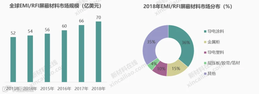目前,电磁屏蔽领域已经形成了相对比较稳定的市场竞争格局,根据BCC Research 2018年发布的报告,全球 EMI/RFI 屏蔽材料市场规模从2013年的52亿美元提高至2018年70亿美元,预计2023年市场规模将达到约92.5亿美元,2018-202年期间年复合增长率为5.7%。