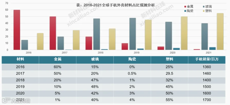 随着4G/5G的商用,金属手机后壳淘汰速率将进一步加快,玻璃/陶瓷/塑料将成为三大主要原材料。