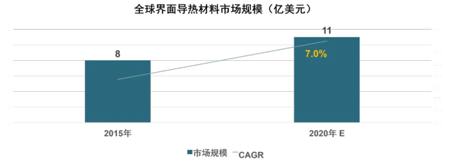 消费电子走向小型化、轻薄化、智能化,5G 商用带来的通信基站设备投入,以及动力电池的蓬勃发展有望大幅拉动导热材料需求。据统计,2015年全球界面导热材料市场规模为8亿美元,2020年有望达到11亿美元,CAGR为7%。