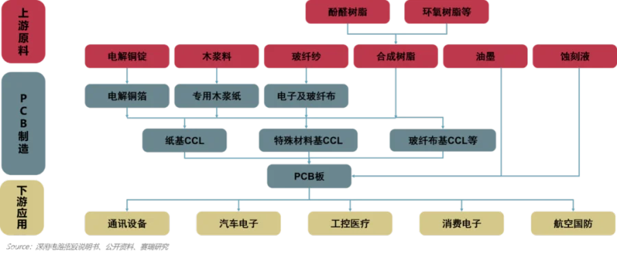 PCB产业链由上游的铜箔、玻纤、覆铜板,中游的PCB制造以及下游的行业应用构成。