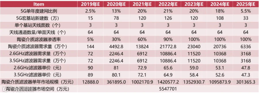 ▲国内5G陶瓷介质滤波器市场空间测算