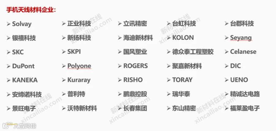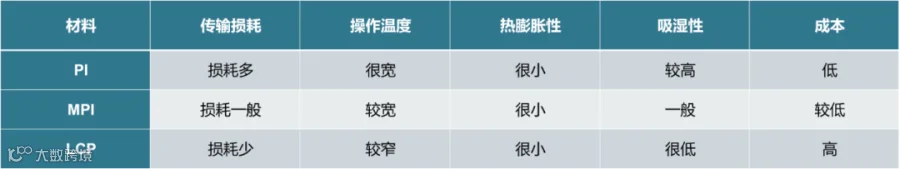 随着天线技术的升级,天线材料变得越来越多样。最早的天线由铜和合金等金属制成,后来随着FPC工艺的出现,4G时代的天线制造材料开始采用PI膜(聚酰亚胺)。但PI在10Ghz以上损耗明显,无法满足5G终端的需求,凭借介子损耗与导体损耗更小,具备灵活性、密封性等特性,LCP(Liquid Crystal Polymer,液晶聚合物)逐渐得到应用。但LCP造价昂贵、工艺复杂,目前MPI(Modified Polyimide,改良的聚酰亚胺)有望成为5G时代早期天线材料的主流选择之一。