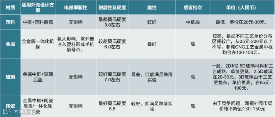 ▲5G手机后盖材料性能对比