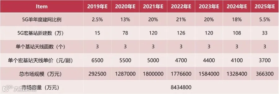 5G建设初期,单个天线系统(振子+PCB+天线罩+结构件+接口等)的价格约6500元,未来价格有望持续下降,初步估算2019年国内市场规模为29.25亿元,2019-2025年国内市场容量将超过843亿元。