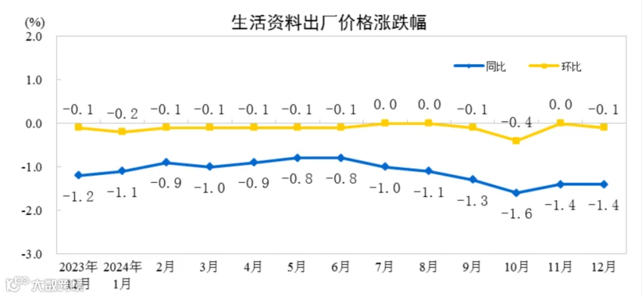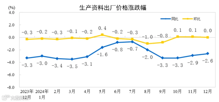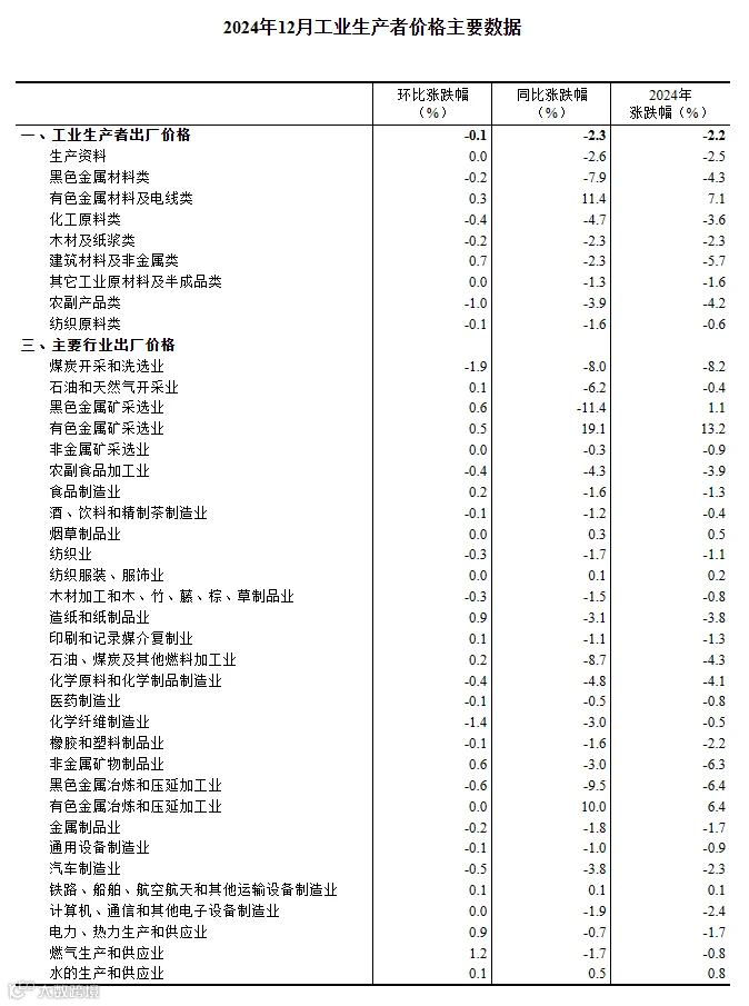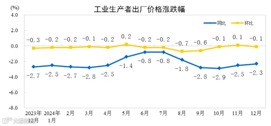 2024年12月份,全国工业生产者出厂价格和购进价格同比均下降2.3%,降幅比上月均收窄0.2个百分点;环比均下降0.1%。2024年全年,工业生产者出厂价格和购进价格均下降2.2%,降幅比上年分别收窄0.8、1.4个百分点。