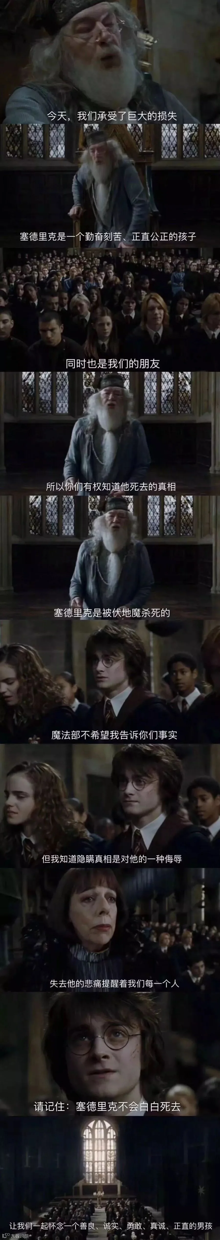 因此,他们决定粉饰太平,掩盖塞德里克死亡的真相,并将其归咎为三强争霸赛中的一场意外。而且,魔法部还指责哈利不过是个到处造谣的骗子,污蔑希望告诉学生们真相的校长邓布利多已经“老糊涂”了。