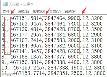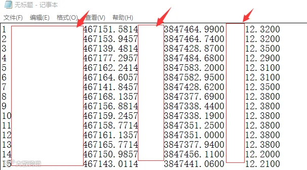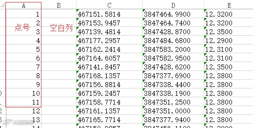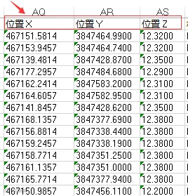 打开提取生成的*.xls,可以看到下图所示的坐标信息。接下来就是将这些坐标信息,编辑生成CASS的坐标文件(*.dat)