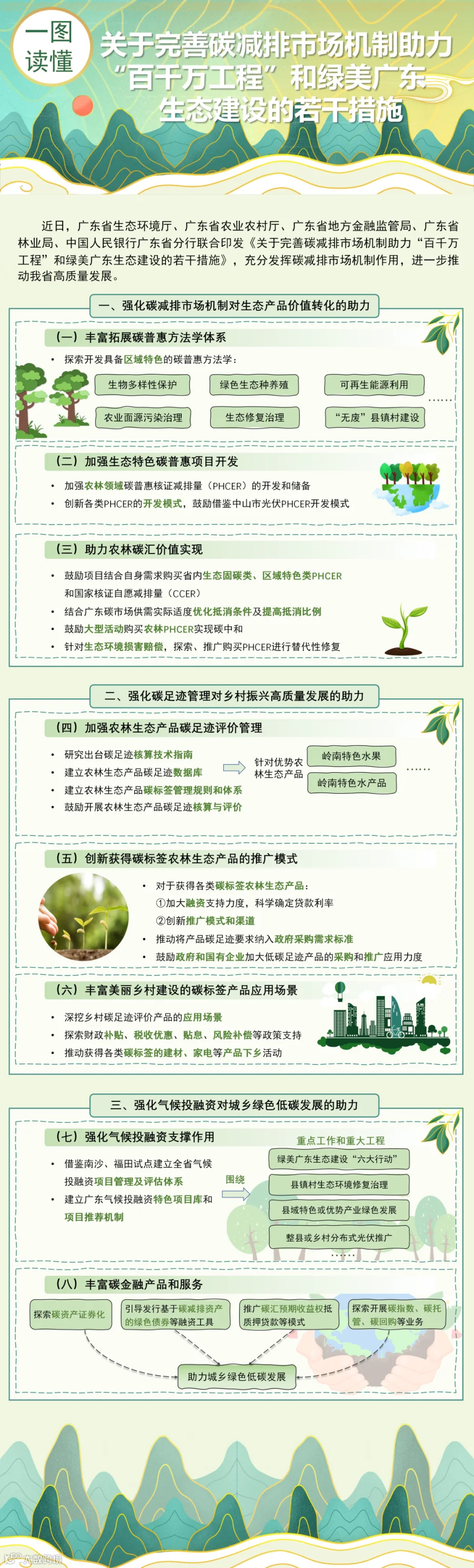 近日,广东省生态环境厅、广东省农业农村厅、广东省地方金融监管局、广东省林业局、中国人民银行广东省分行联合印发《关于完善碳减排市场机制助力“百千万工程”和绿美广东生态建设的若干措施》,充分发挥碳减排市场机制作用,进一步推动我省高质量发展。现在带大家一图读懂→