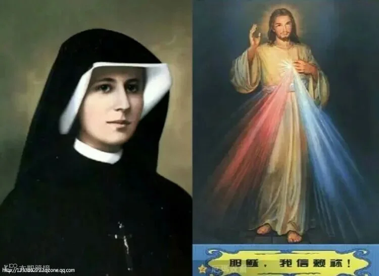 天主慈悲的肖像,是1931年2月22日在普沃茨克耶稣第一次显现给她时的印象。她在日记中这样写道:“那天晚上,我在我的小屋里的时候,我看见主耶稣:他穿着红色的长袍,右手举起来做降福的姿态,左手放在胸前,从那里流射出两束光芒——束红色,一束白色。我静静地双眼凝视着主耶稣,我的灵魂充满敬爱之情,而且极大欢喜。过了一会儿,耶稣对我说:“按照你现在看到的画一张像,题上词:‘耶稣,我信赖你。’我渴望这个像受到尊敬,首先在你们的小堂里,然后传到全世界。我许下,凡敬爱这像的人不会丧亡丢灵魂:我还许下,他在世界上战胜敌人获得胜利,特别是在他临终的时候。我自己要亲自进行保卫,视为我自己的光荣。”