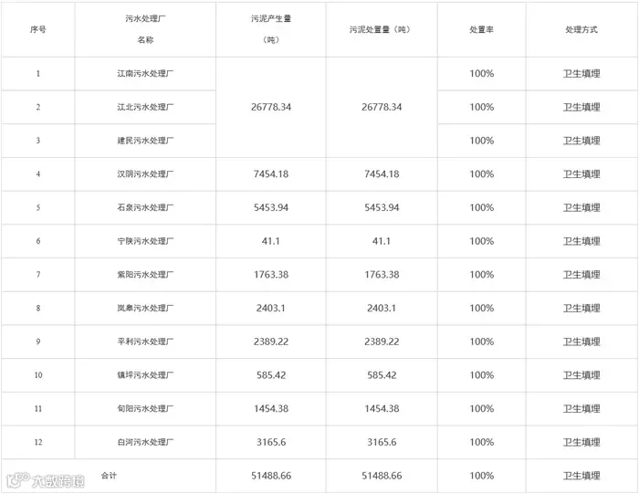 2023年,全市建成并运行的城镇污水处理厂12座,年污泥产生量约为5.15万吨,处置量为约5.15万吨,处置率100%。2023年污泥产生处置具体情况见表7。
