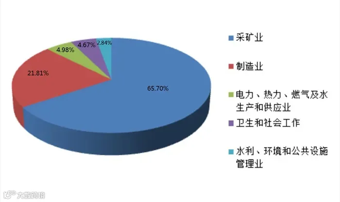 2023年,一般工业固体废物产生量排名前5的行业依次为采矿业,制造业,电力、热力、燃气及水生产和供应业,卫生和社会工作,水利、环境和公共设施管理业,分别占全市一般工业固体废物产生量的65.7%、21.81%、4.98%、4.67%、2.84%,详细情况见图1。