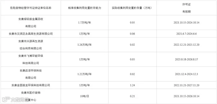 2023年,本市共有7家危险废物(含医疗废物)许可证持证单位,其中危险废物收集、经营单位5家,核准收集、贮存危险废物种类为HW08废矿物油与含矿物油废物、HW31含铅废物、HW49其他废物、HW50废催化剂,核准收集、贮存能力达到6.18万吨/年。医疗废物处置单位1家,核准收集、处置危险废物种类为HW01医疗废物,核准收集、处置能力到10吨/日。水泥窑协调处置危险废物经营单位1家,核准收集、利用、处置、贮存危险废物种类为HW02(医药废物)全子项;HW03(废药物、药品)900-002-03;HW04(农药废物)263-008-04、263-010-04、263-011-04、263-012-04、900-003-04;HW05(木材防腐剂废物)全子项;HW06(废有机溶剂与含有机溶剂废物)全子项;HW08(废矿物油与含矿物油废物)全子项;HW09(油/水、烃/水混合物或乳化液)全子项;HW11(精(蒸)馏残渣)全子项;HW12(染料、涂料废物)全子项;HW13(有机树脂类废物)全子项;HW14(新化学物质废物)900-017-14;HW17(表面处理废物)除336-100-17外其他子项;HW18(焚烧处置残渣)全子项;HW19(含金属羰基化合物废物)900-020-19;HW22(含铜废物)全子项;HW23(含锌废物)全子项;HW24(含砷废物)261-139-24;HW31(含铅废物)全子项;HW32(无机氟化物废物)900-026-32;HW33(无机氰化物废物)全子项;HW34(废酸)全子项;HW35(废碱)全子项;HW39(含酚废物)261-070-39、261-071-39;HW40(含醚废物)261-072-40;HW46(含镍废物)261-087-46、384-005-46、900-037-46;HW47(含钡废物)261-088-47、336-106-47;HW48(有色金属冶炼废物)包含除323-001-48、321-031-48、321-032-48外其它子项;HW49(其他废物)包含除309-001-49、900-053-49外其他子项;HW50(废催化剂)全子项,核准收集、利用、处置、贮存能力达到5万吨/年。本市危险废物许可证持证单位情况见表3。