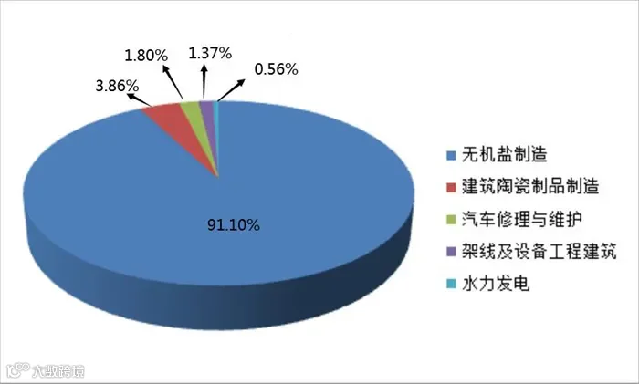 2023年,本市危险废物产生量(不含医废)排名前五的行业依次为无机盐制造、建筑陶瓷制品制造、汽车修理与维护、架线及设备工程建筑、水力发电,分别占全市危险废物产生总量的91.10%、3.86%、1.80%、1.37%、0.56%,详细情况见图2。