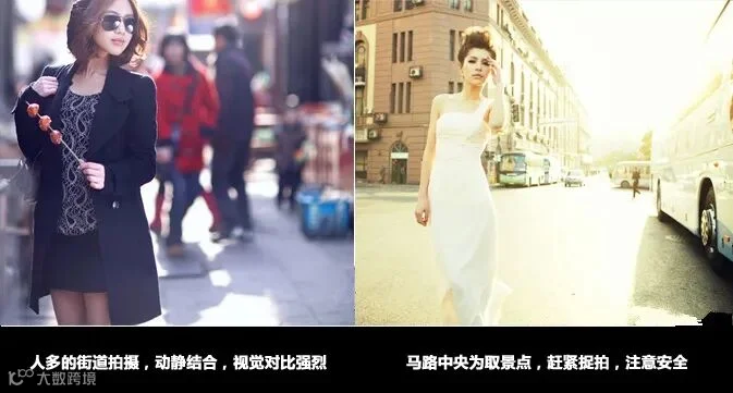 来到繁华的商业区寻找灵感,为突出模特主体,反映热闹道路上匆匆的行人和汽车,可稍微放慢快门来拍摄。