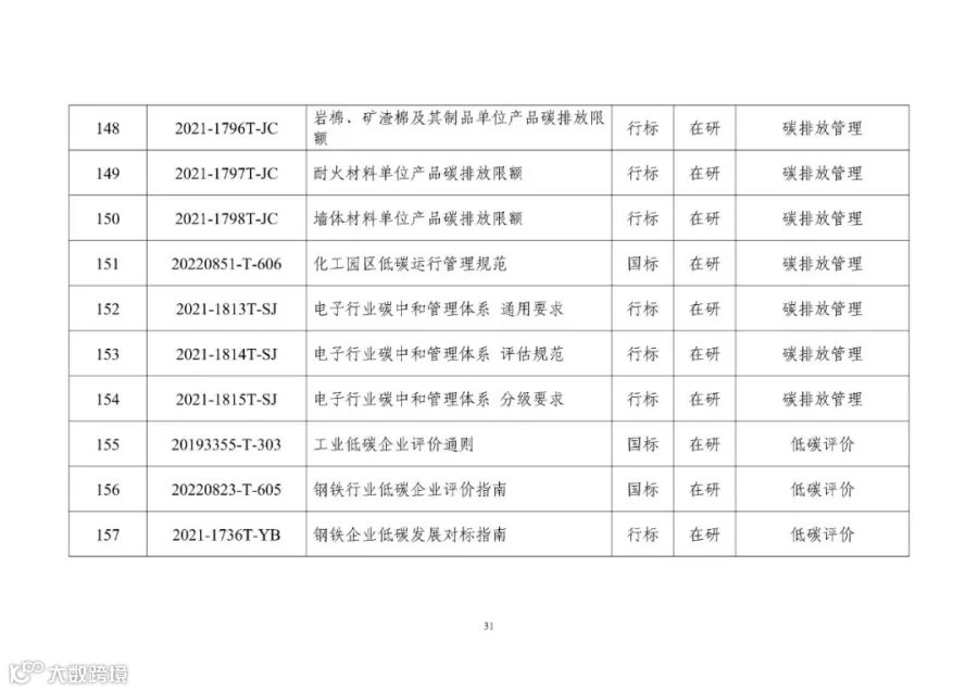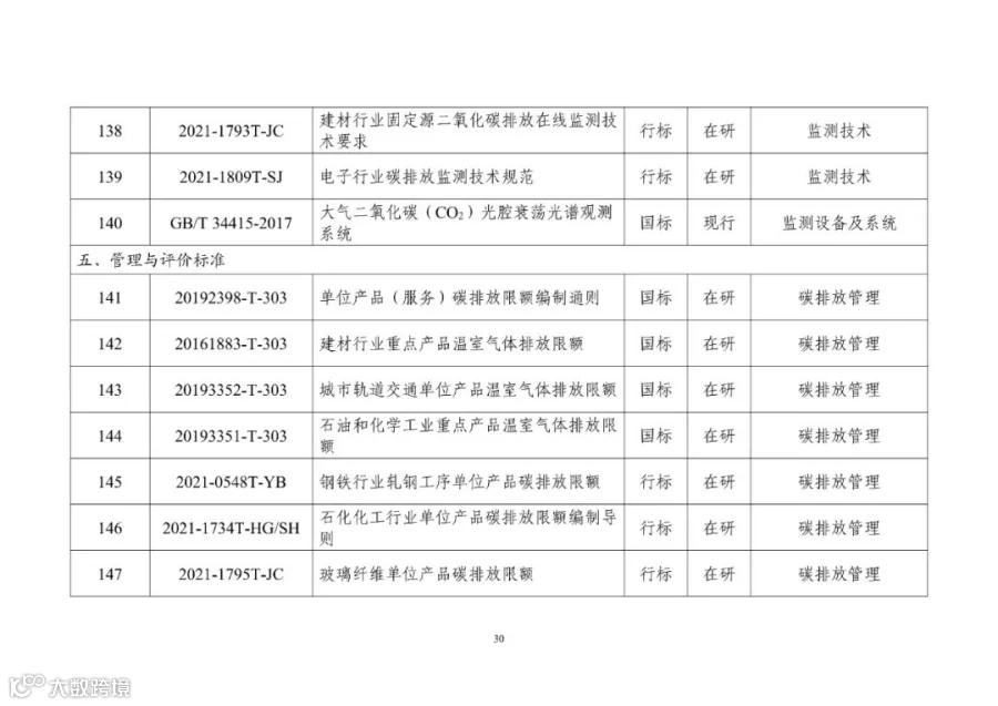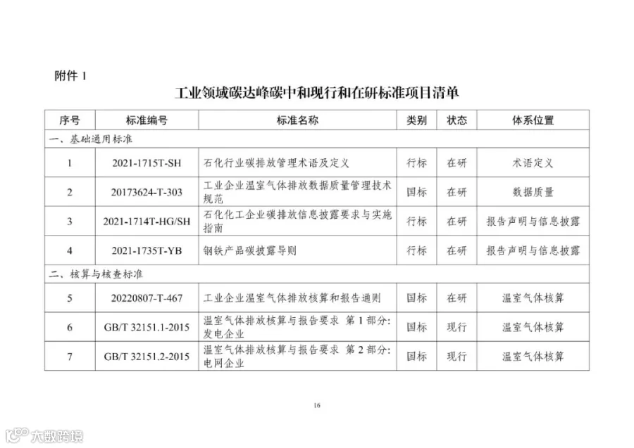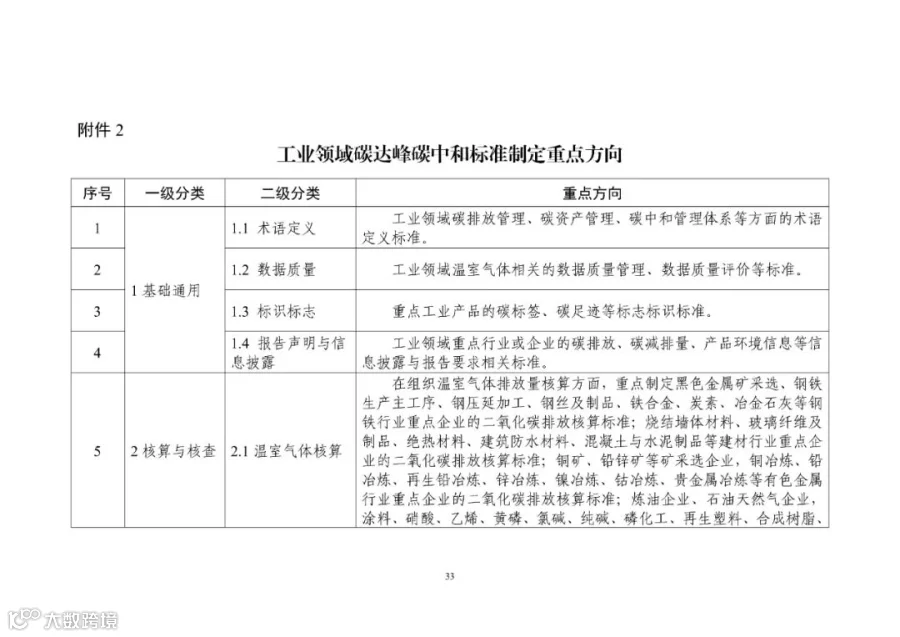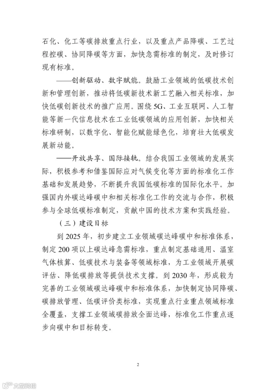 2月21日,工信部印发工业领域碳达峰碳中和标准体系建设指南的通知。通知提出,到2025年,初步建立工业领域碳达峰碳中和标准体系,制定200项以上碳达峰急需标准,重点制定基础通用、温室气体核算、低碳技术与装备等领域标准,为工业领域开展碳评估、降低碳排放等提供技术支撑。到2030年,形成较为完善的工业领域碳达峰碳中和标准体系,加快制定协同降碳、碳排放管理、低碳评价类标准,实现重点行业重点领域标准全覆盖,支撑工业领域碳排放全面达峰,标准化工作重点逐步向碳中和目标转变。