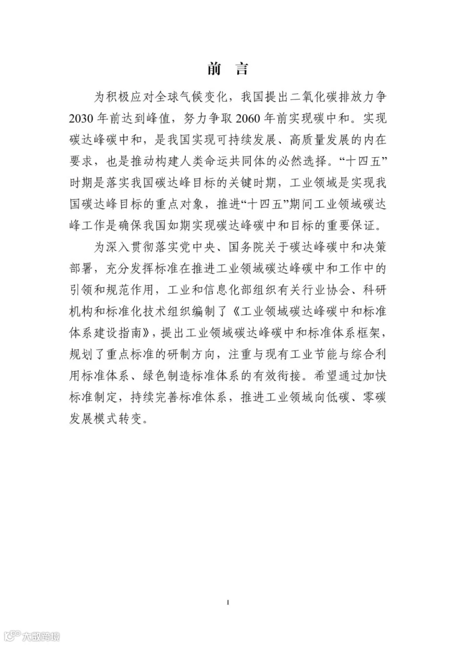 为切实发挥标准对工业领域碳达峰碳中和的支撑和引领作用,工业和信息化部依据《新产业标准化领航工程实施方案(2023-2035年)》《工业领域碳达峰实施方案》《建立健全碳达峰碳中和标准计量体系实施方案》等,组织编制了《工业领域碳达峰碳中和标准体系建设指南》。现印发给你们,请结合本地区、本行业、本领域实际,在标准化工作中贯彻执行。