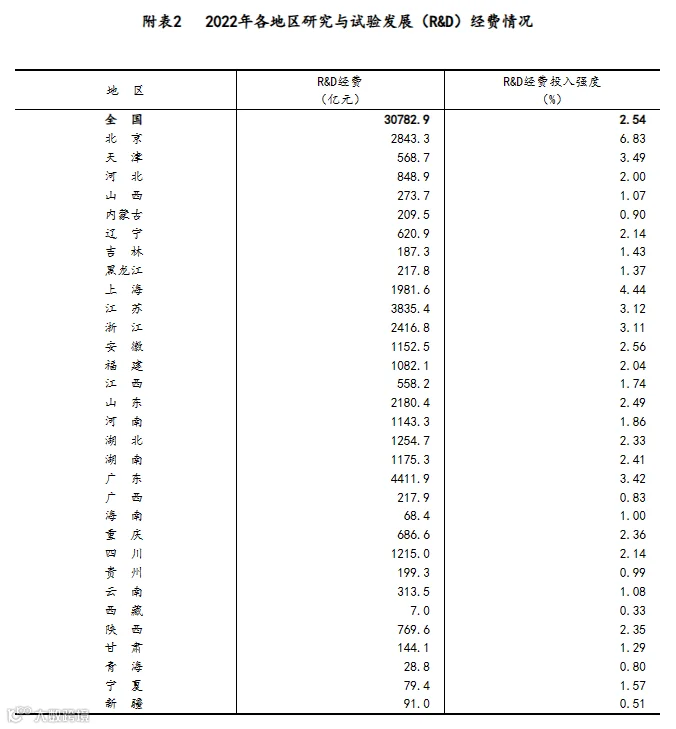2022年,全国共投入研究与试验发展(R&D)经费30782.9亿元,比上年增加2826.6亿元,增长10.1%;研究与试验发展(R&D)经费投入强度(与国内生产总值[2]之比)为2.54%,比上年提高0.11个百分点[3]。按研究与试验发展(R&D)人员全时工作量计算的人均经费为48.4万元,比上年下降0.5万元。