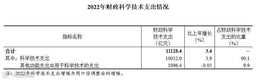 2022年,国家财政科学技术支出11128.4亿元,比上年增加361.7亿元,增长3.4%。其中,中央财政科技支出3803.4亿元,占全国财政科技支出的比重为34.2%;地方财政科技支出7325.0亿元,占比为65.8%。