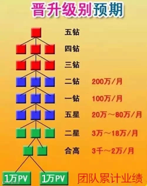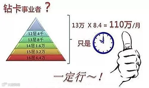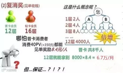 每一个月消费40pv(人民币350元左右)才可以享受到我们下月团队产生的奖金,普卡可以享受到12层,钻卡可以享受到16层。如图:第一层2人,第二层4人,第三层8人,这样倍增下来,到第12层4000多人,前后加起来共8000多人,只要有一个人消费40pv 你就能拿到8.4元。8000个人每人消费40pv,你的收入就是6.7万元/月。