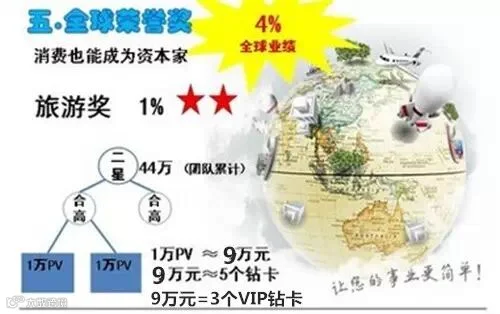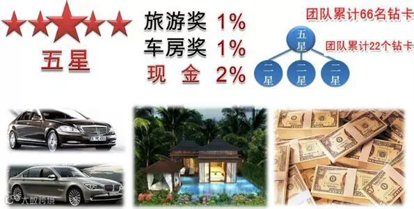 海外旅游,车房、游艇,还有现金分红...既有物质上的褒奖,还有精神上的刺激,真正的体会到事业成功时的辉煌。二星就可以分红,五星就可以分房、分车、分钱。