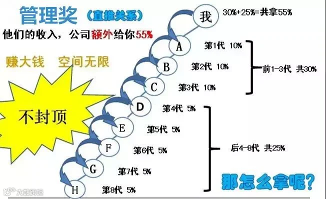 如图:最多可以拿到自己推荐的8代的收入的55%,前三代10%,后5代5%(举例:你推荐A,A 推荐B,B 推荐C,A 是你的第一代,B 是你的第二代,C 是你的第三代)(注:管理奖是公司额外发给你的,不是从你推荐的人的收入中扣除的)
