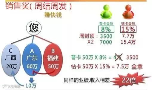 再看上图:因为最多可以做三个部门,如果你启动了第三个部门C,假设C 的业绩是20 万,就用小区业绩10 万乘以会员级别对应提成比例,该拿多少就拿多(注:三个区的时候周封顶乘以2倍)(同样的业绩,钻卡普卡收入相差22倍,今天您的投资将决定您2---3年后的收益。)
