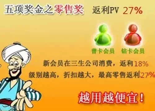 只要成为三生公司的会员,不论是你开始销售公司的产品还是自己消费,就会享受产品PV值的18%零售利润返利,消费按照全价,次月返回利润